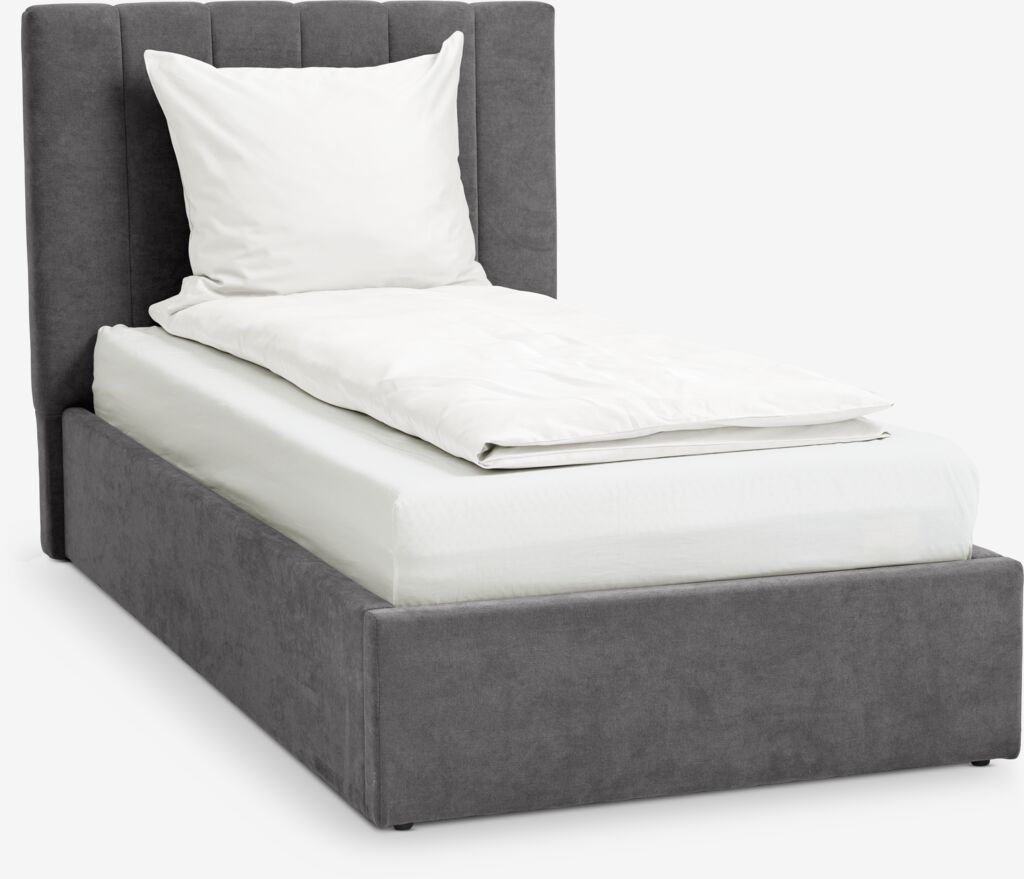 Fabric. With storage space and bed base with hydraulic lift. Fits spring and foam mattresses 90x190 cm. Incl. slatted base. Excl. mattresses. Single W110 x L207 x H112 cm