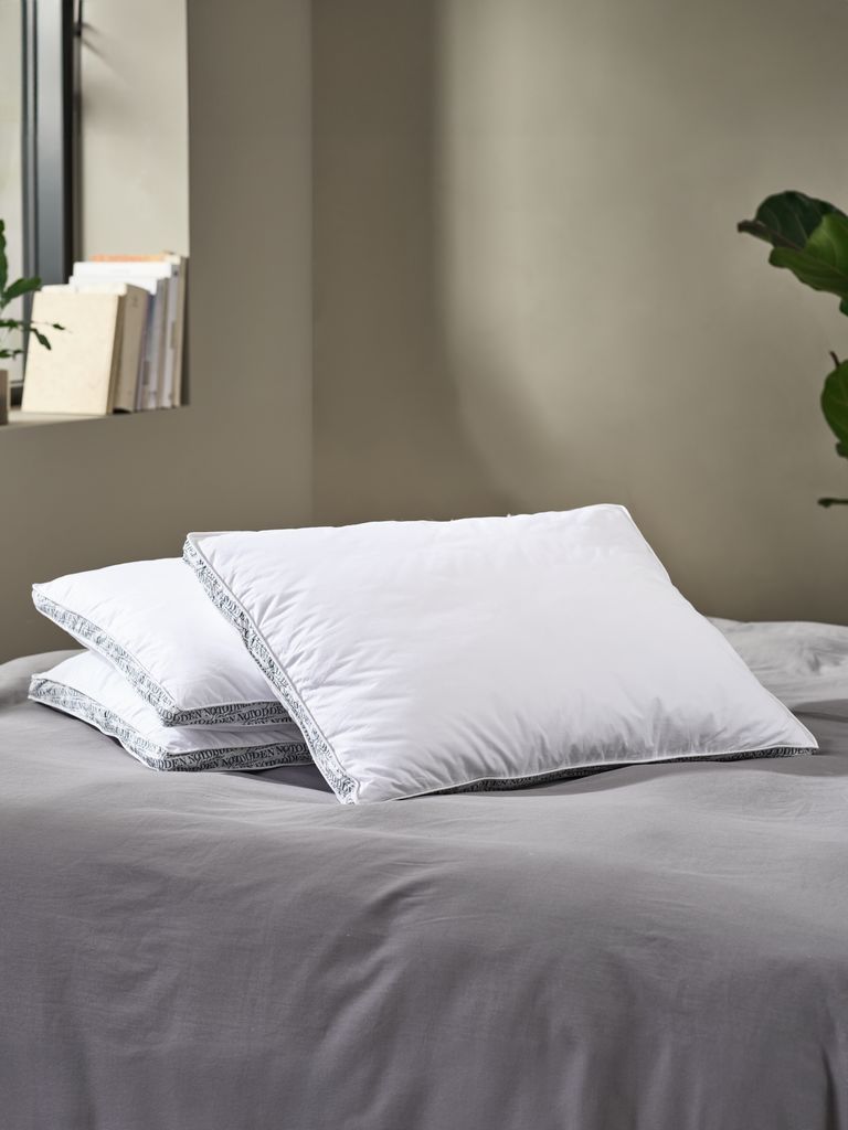 Pillow 50x70/75 cm with 3 chambers and a boxed edge design allowing the pillow to retain its shape and provide even support. Filled with 100% fibre down in the outer chambers and 100% duck feathers in the inner chamber, 870g. Soft 100% cotton cambric casing. Wash 60°C.