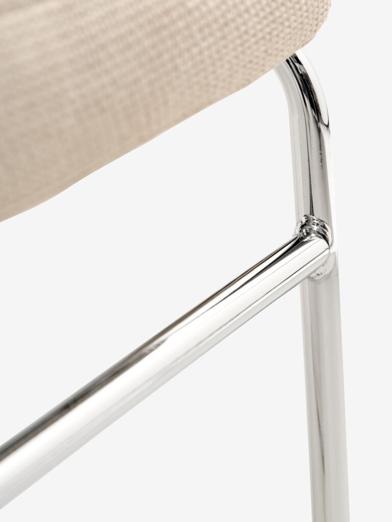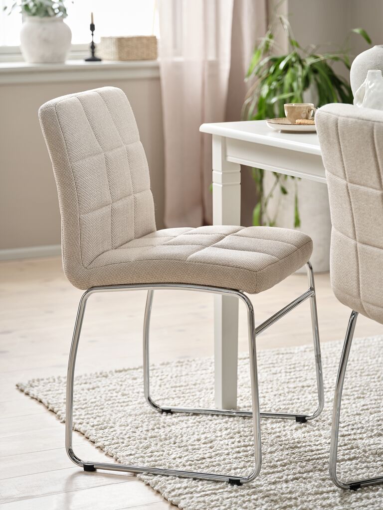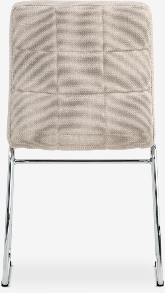 Dining chair with padded seat and backrest in beige fabric. Legs in chrome.