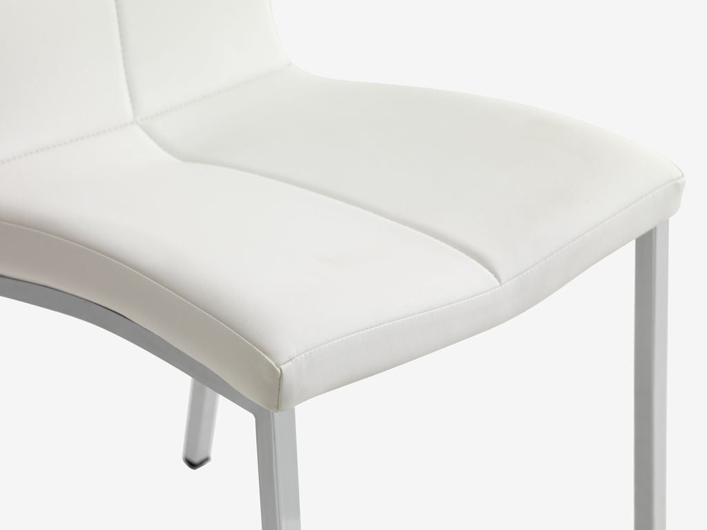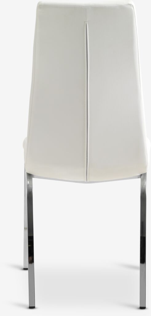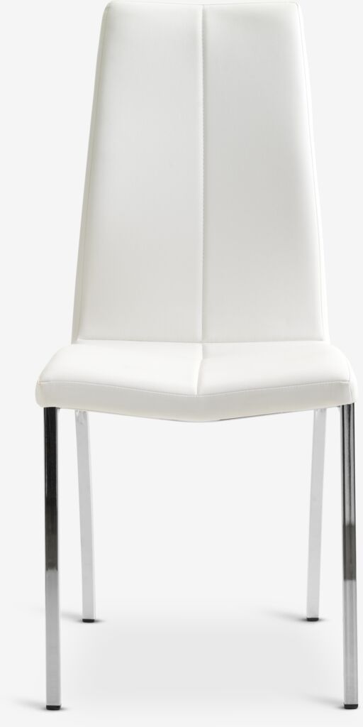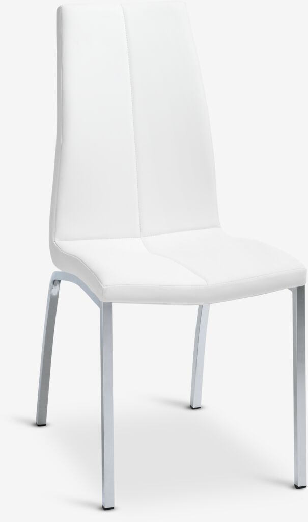 Dining chair with padded seat and backrest in white faux leather. Legs in chrome.