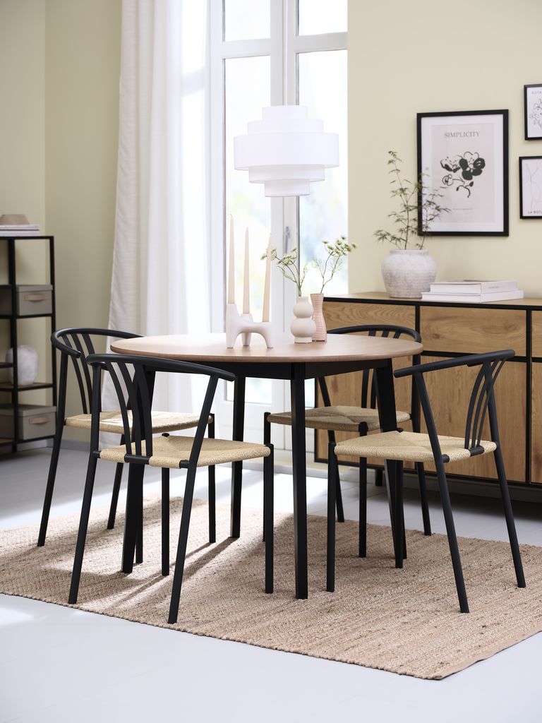 Table: Solid wood and oak veneer. D105 x H75 cm. Chair: Paper cord and steel.