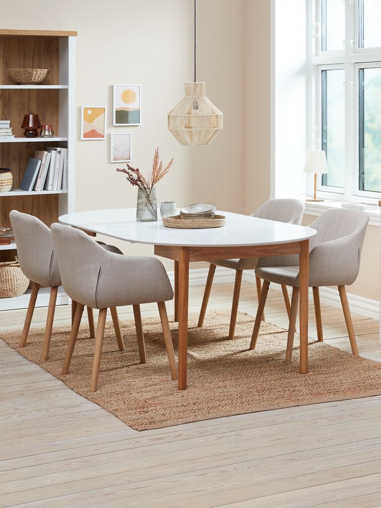 Table: Solid wood and MDF. D110 x H75 cm. Incl. 2 leaves. Size when extended W110 x L200 x H75 cm. Chair: Fabric and solid wood.