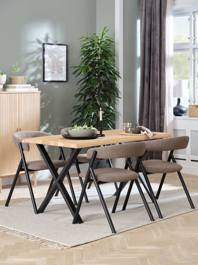 Table: Solid oak and steel. W80 x L140 x H75 cm. Chair: Fabric and steel.