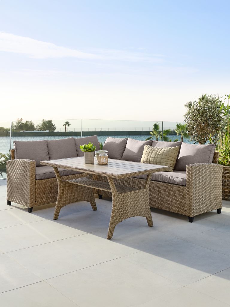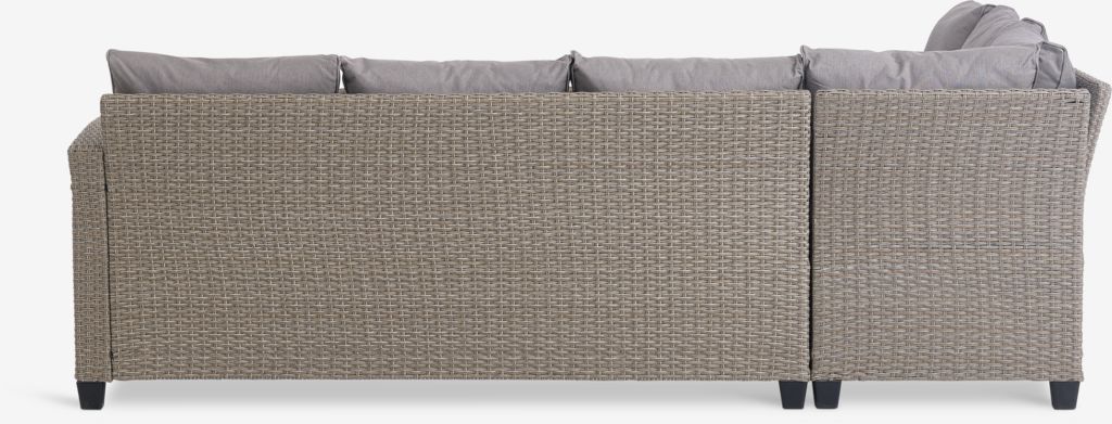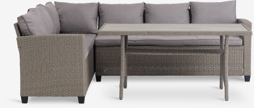 6-seater lounge set. Table: Steel, artificial wood and polyrattan. W74 x L144 x H67 cm. 6-seater sofa: Steel and polyrattan. Cannot be reversed. Incl. luxury cushions with durable, structure-woven cover.