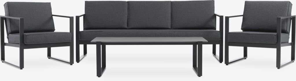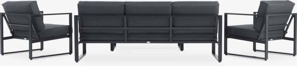 Sit comfortably in your outdoor space with the VONGE lounge set. This black 5-seater set consists of a sofa and 2 chairs with comfortable cushions and a matching lounge table with a sintered tabletop.