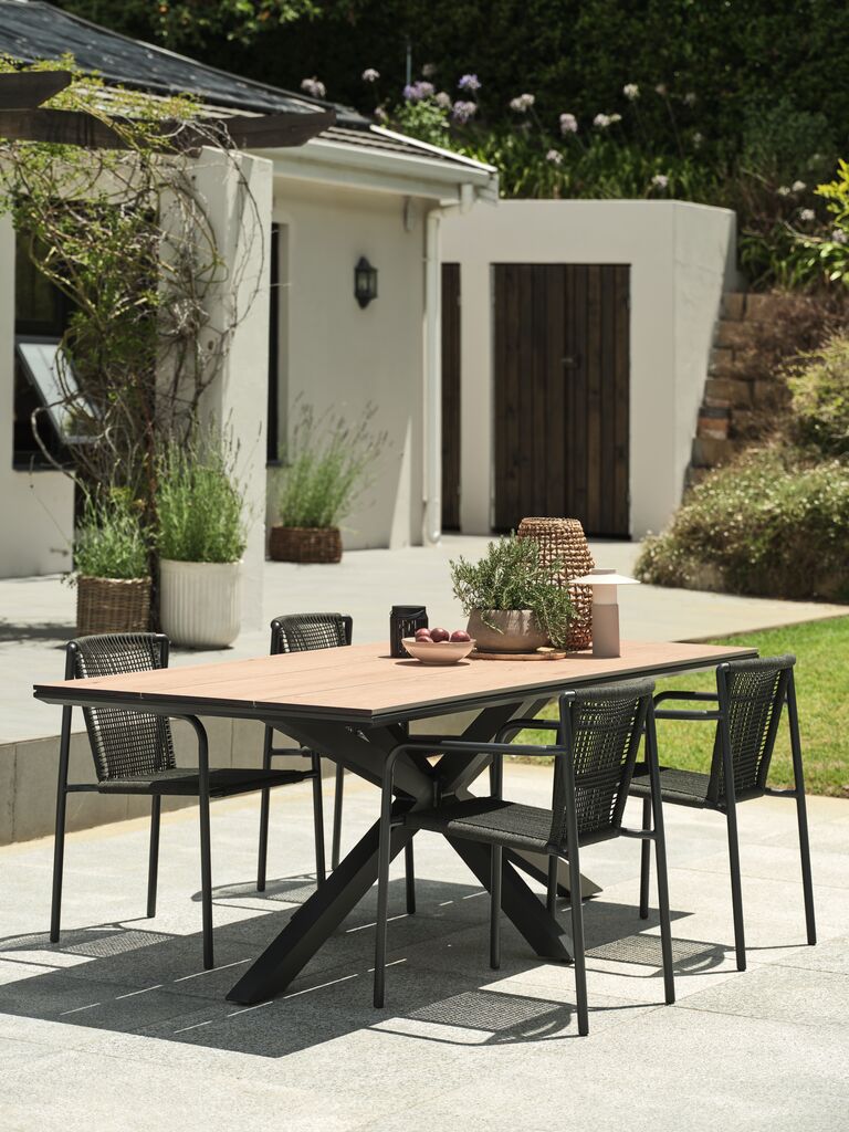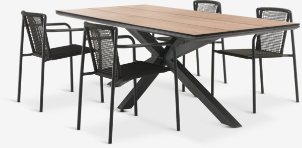 4-seater garden furniture set. Table: Aluminium and DURAWOOD® composite wood. DURAWOOD® is a durable composite material consisting of FSC® hardwood fibre and plastic. W100 x L215 x H75 cm. Chair: Steel and polyester. Stackable.