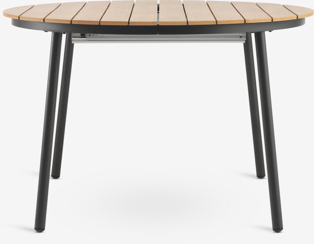 Extendable garden table with pull-out mechanism. Including 1 extension leaf, which can be stored under the tabletop. The round garden table has a tabletop in artificial wood. Frame in aluminium and legs in powder-coated steel. Artificial wood has the appearance and texture of natural wood without the need for maintenance. Aluminium is a lightweight and robust material that does not rust. You can easily extend the table to 168 cm to accommodate larger gatherings. D118 x H75 cm