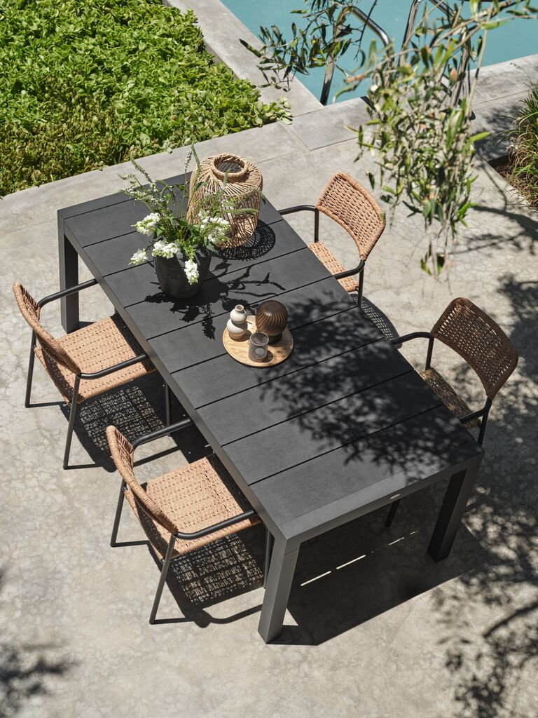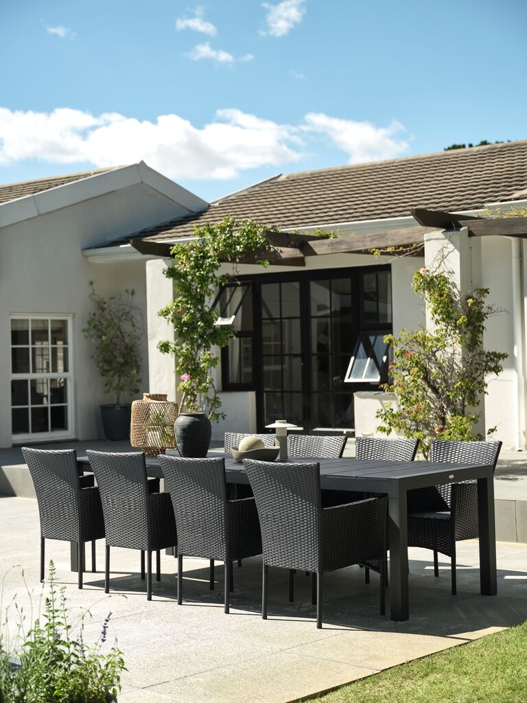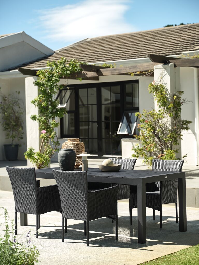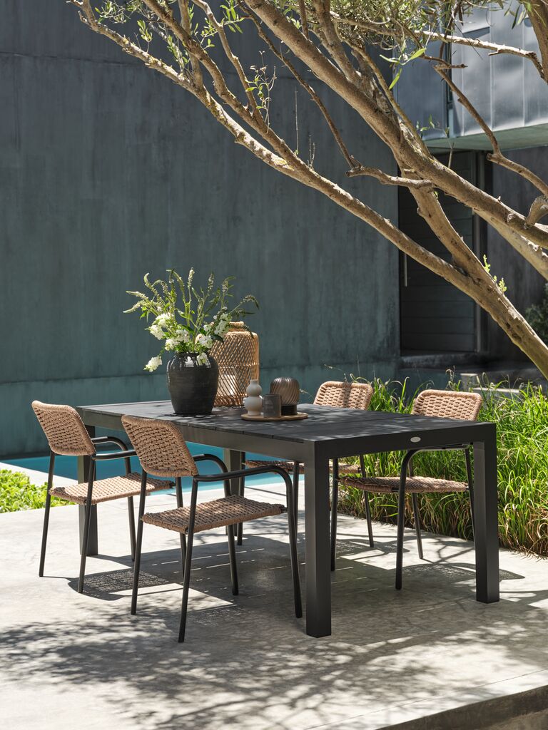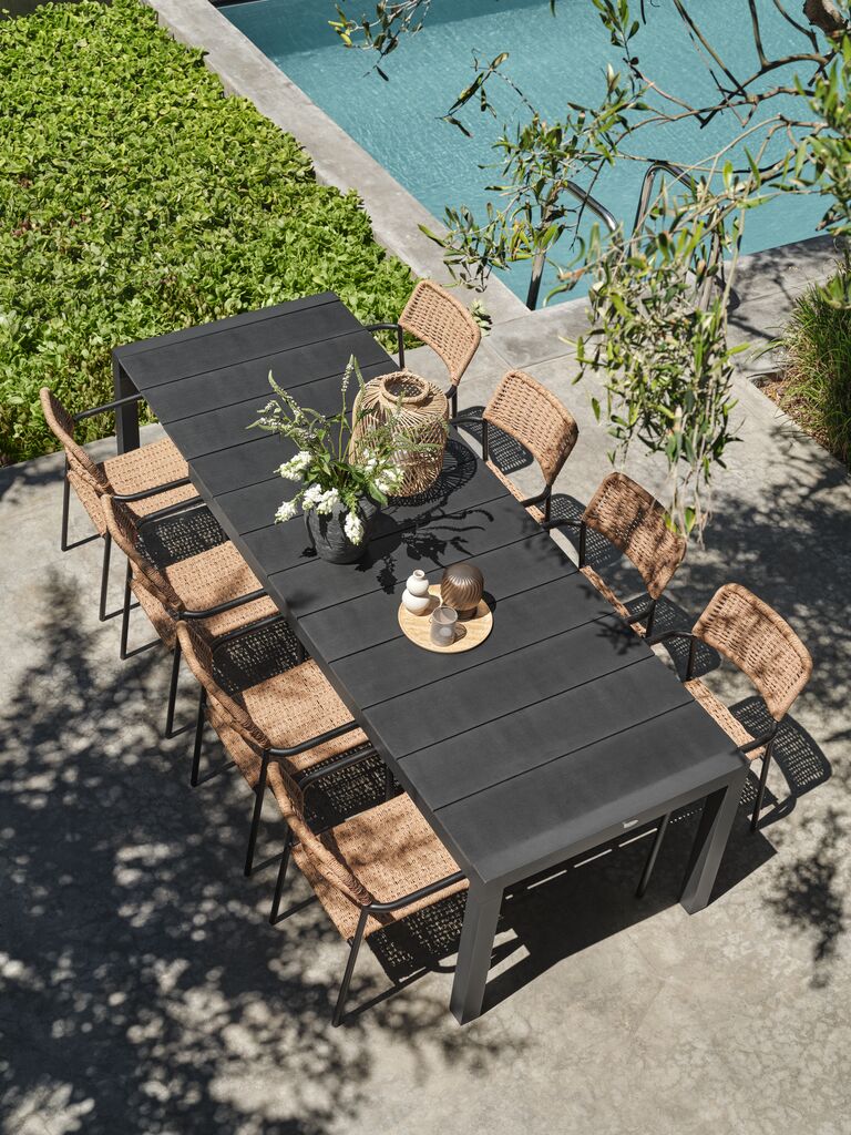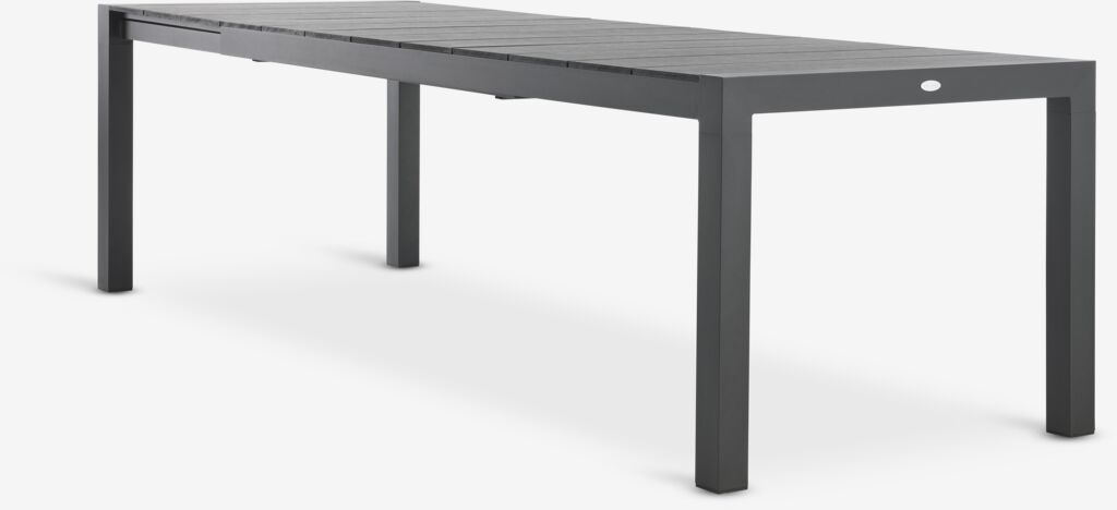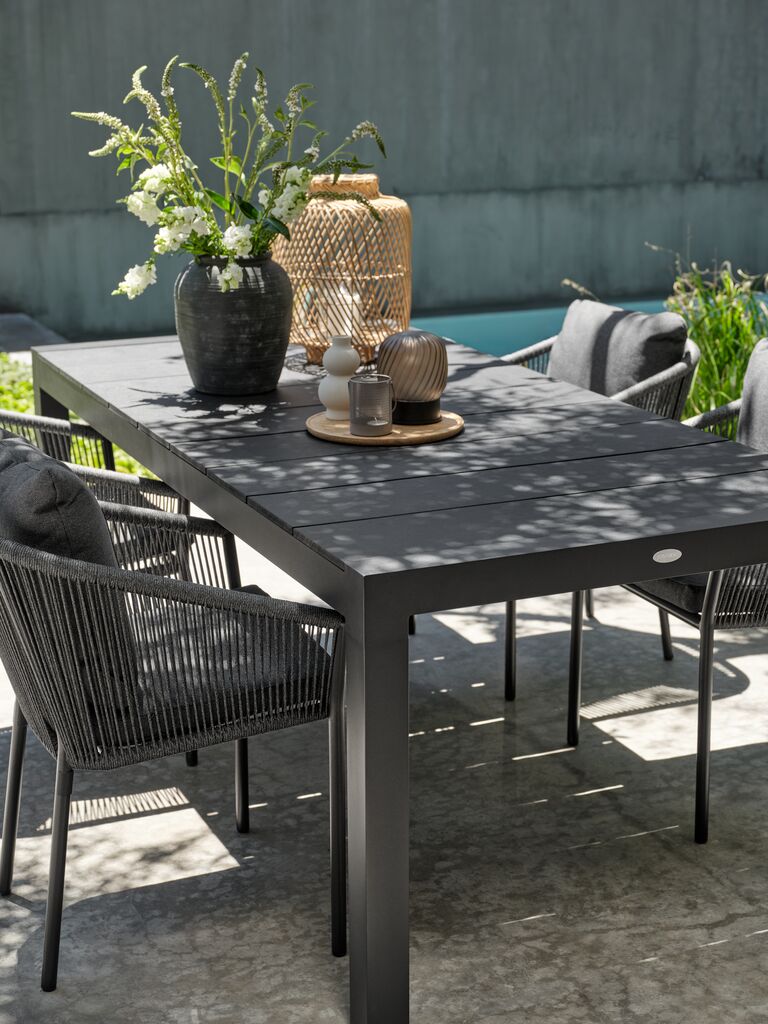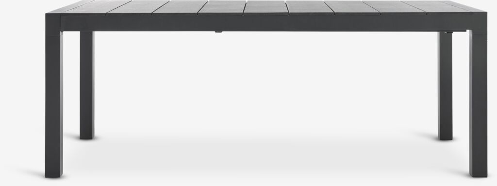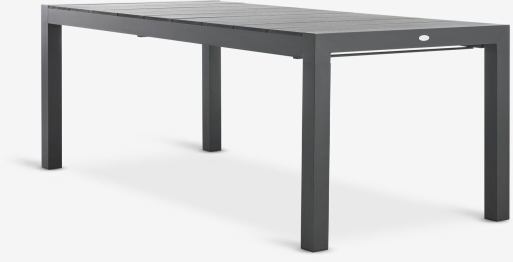 Extendable garden table with pull-out mechanism. Including 1 extension leaf, which can be stored under the tabletop. The garden table has a tabletop in artificial wood. Black frame and legs in powder-coated aluminium. Artificial wood has the appearance and texture of natural wood without the need for maintenance. Aluminium is a lightweight and robust material that does not rust. You can easily extend the table to 272 cm to accommodate larger gatherings. W95 x L208 x H76 cm