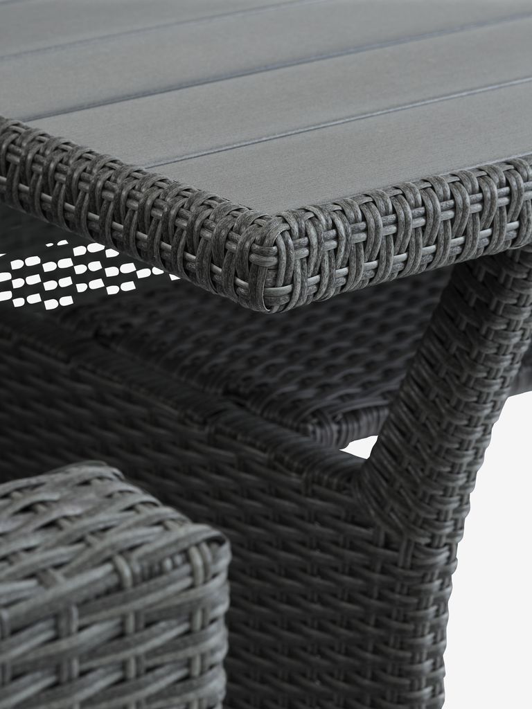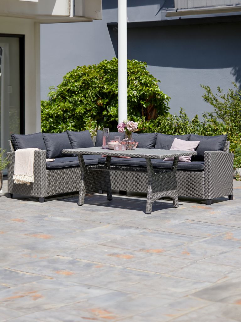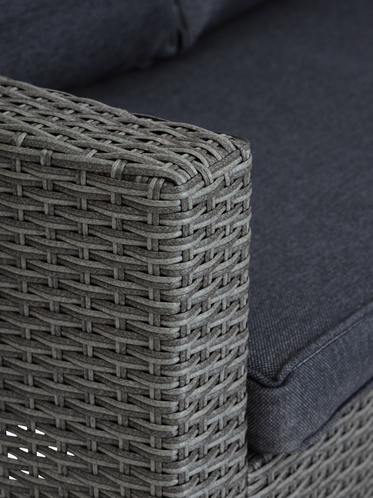 6-seater lounge set. Table: Steel, artificial wood and polyrattan. W74 x L144 x H67 cm. 6-seater sofa: Steel and polyrattan. Cannot be reversed. Incl. luxury cushions with durable, structure-woven cover.