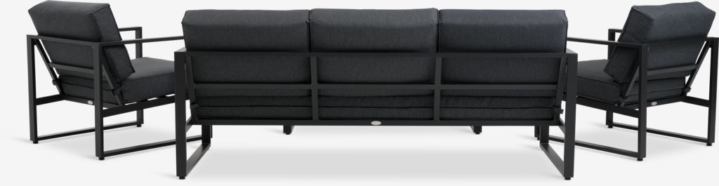 Sit comfortably in your outdoor space with the VONGE lounge set. This black 5-seater set consists of a sofa and 2 chairs with comfortable cushions and a matching lounge table with a fibre cement tabletop.
