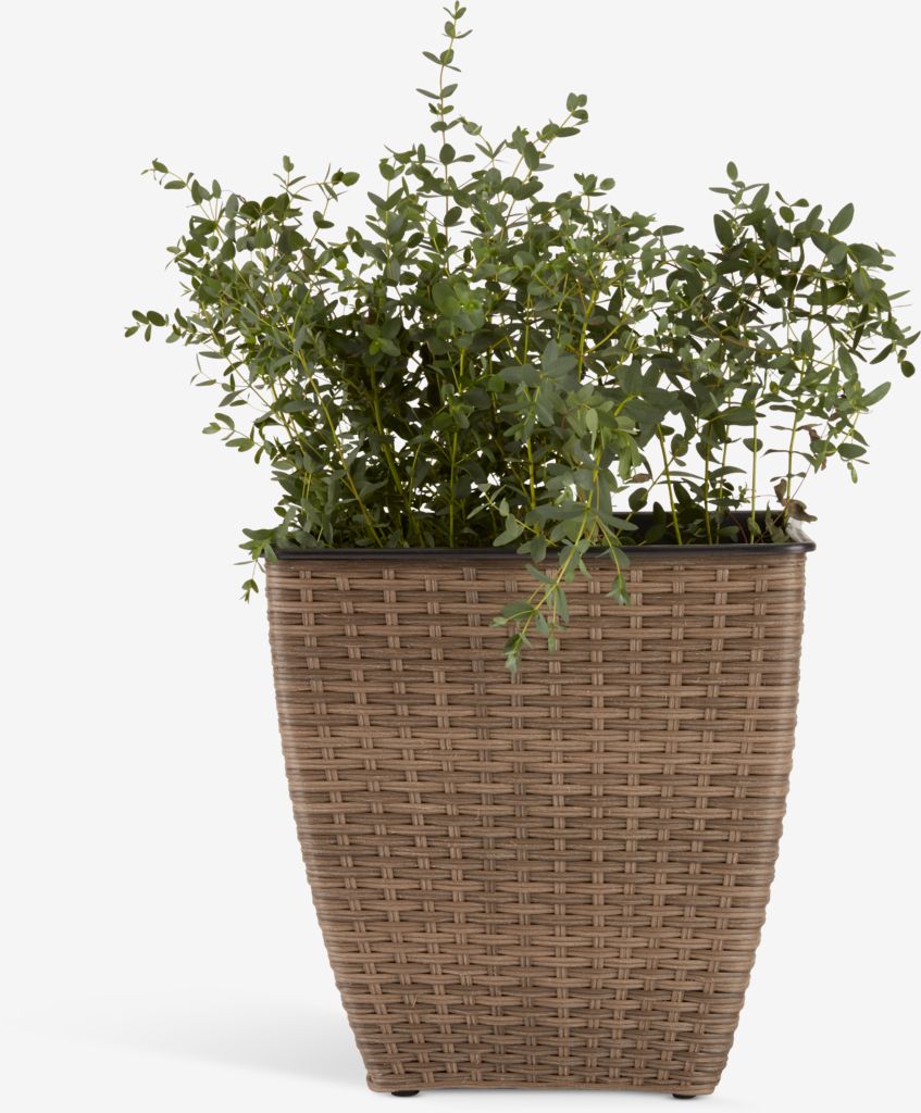 Lightweight planter basket made from polyrattan, plastic and steel. Polyrattan provides a natural wicker look, while being weather-resistant. This basket is a durable alternative to natural materials such as rattan. A drainage hole can easily be made to ensure that excess water can drain away. Available in assorted colours. W38 x L38 x H39 cm