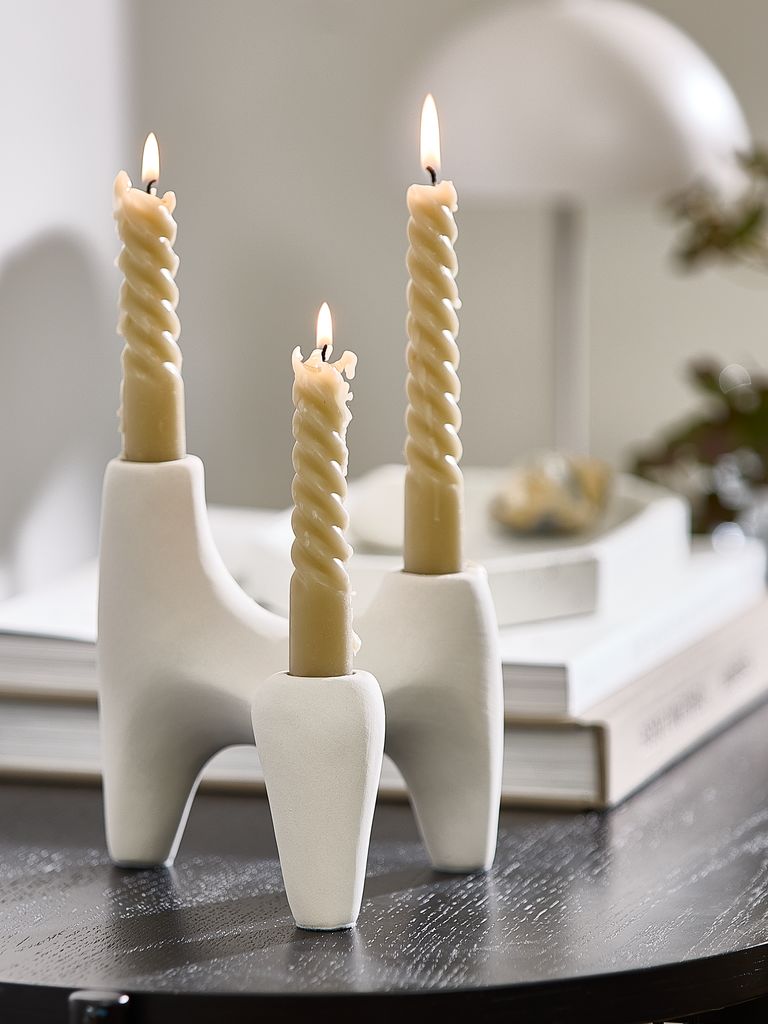 Candlestick in off-white stoneware with a sculptural and modern design. Its soft, curved form holds three candles at different heights, creating a dynamic and artistic expression. W13 x L16 x H15 cm