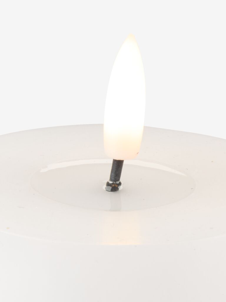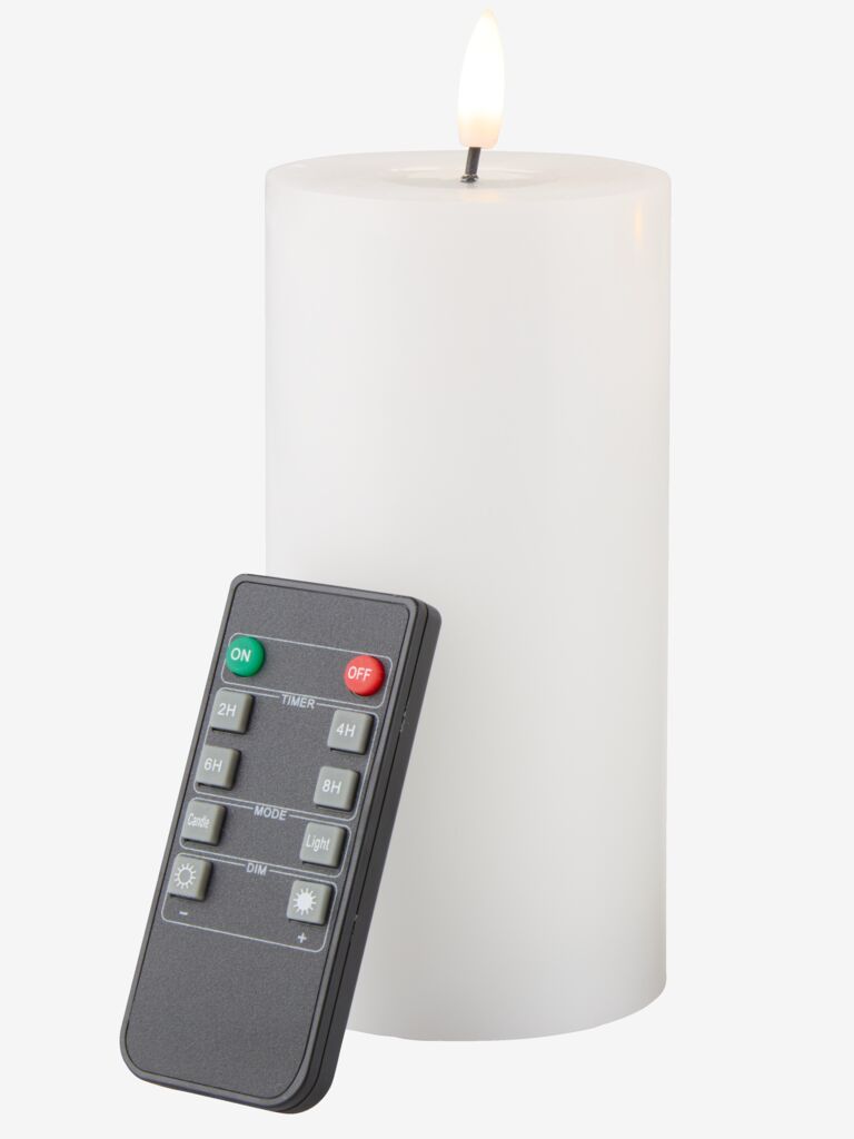 Pack of 3 white LED pillar candles in different heights. The candles have a built-in timer function and a remote control for easy operation. They emit a warm light and create a cosy atmosphere in the home. The candles require batteries (not included). D8 x H10 / 13 / 15 cm