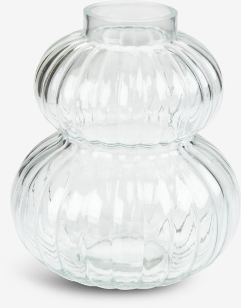 Clear glass vase featuring a unique double-gourd design with ribbed detailing. This elegant vase offers a sophisticated touch to any interior decor, making it perfect for displaying flowers or as a standalone decorative piece. D14 x H16 cm