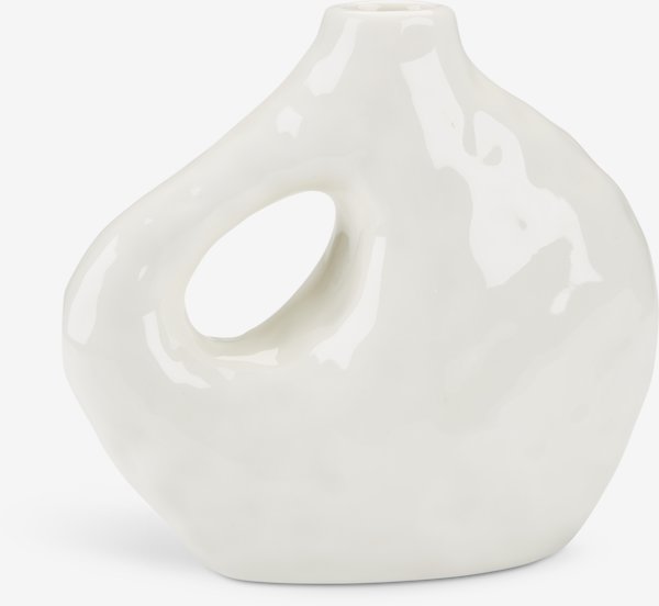 White vase made from porcelain featuring a unique, asymmetrical design with a central cut-out. This modern piece adds a touch of elegance and sophistication to any room. Ideal for use as a standalone decorative element or for displaying flowers. W16 x L7 x H14 cm