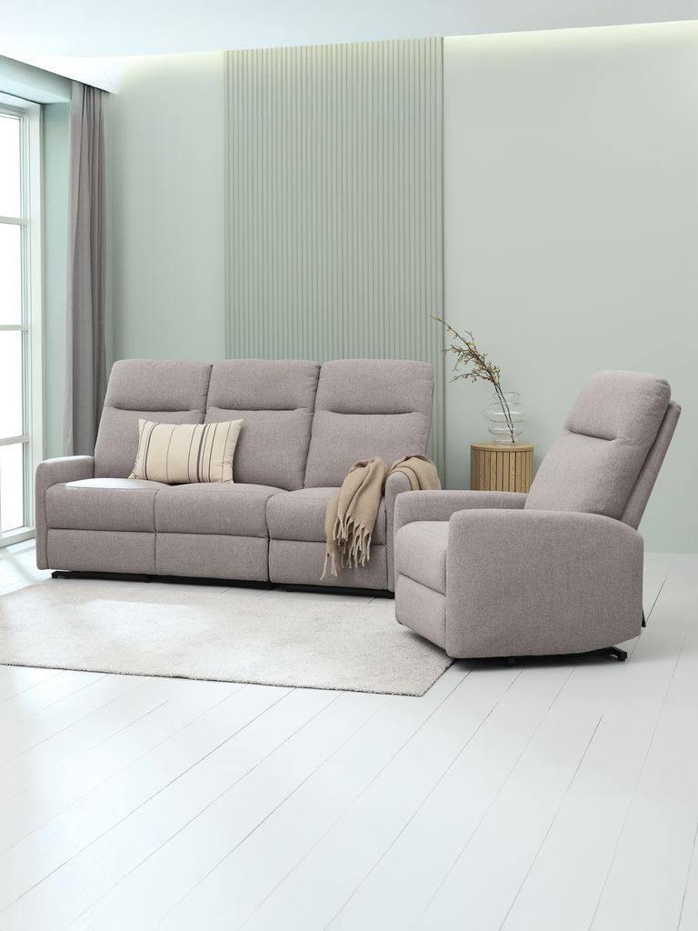 Fabric. Seat cushion with pocket springs and foam padding. Back cushion in foam. Base in steel. With electrically operated lift function, stepless tilt mechanism and built-in leg rest. W78 x H110 x D97 cm