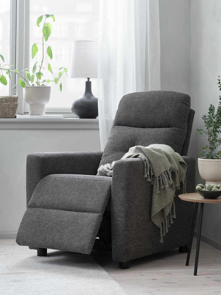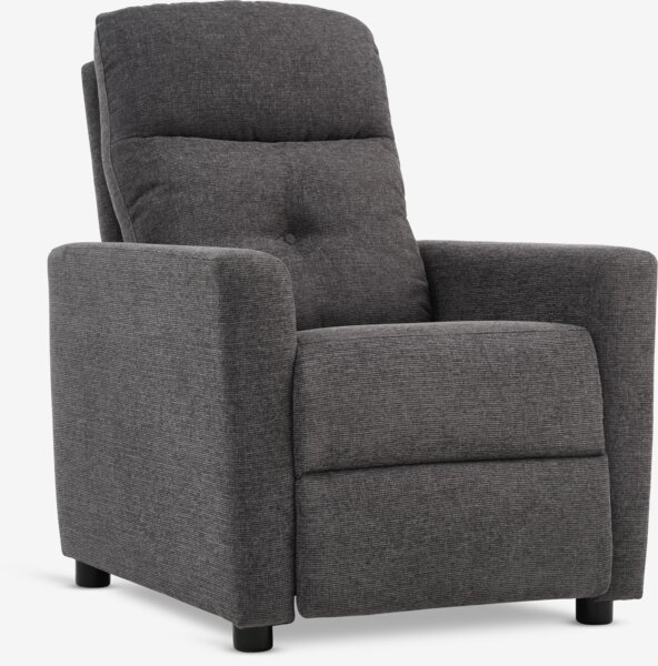 Fabric. Seat cushion with pocket springs and foam padding. Back cushion in foam. With stepless tilt mechanism and built-in leg rest. W75 x H100 x D91 cm