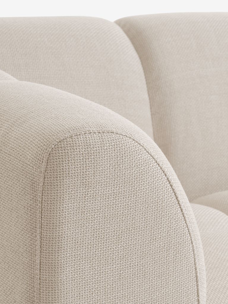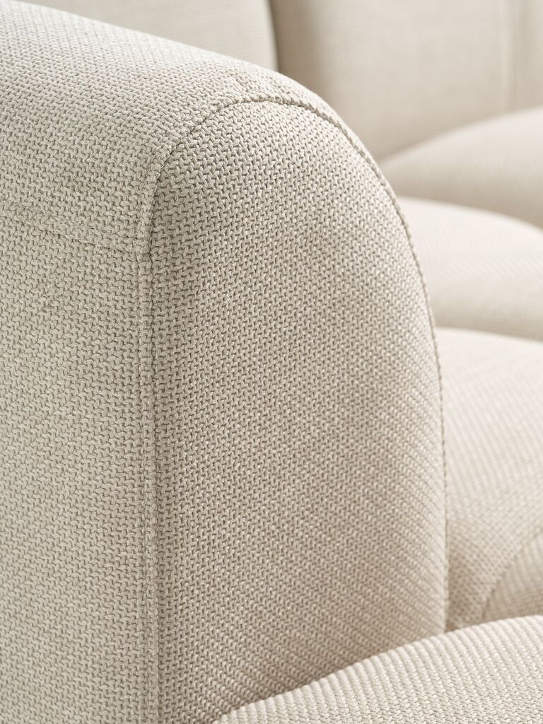 Lovely sofa, it’s medium firm but comfortable. I find that the fabric can dint but it bounces back after a little bit. (If you lent in you elbow for a while it would show) Happy with purchase. It’s very sleek and clean looking. Pictures on webpage don’t reflect colour though it’s a soft beige not as light as the pictures here though