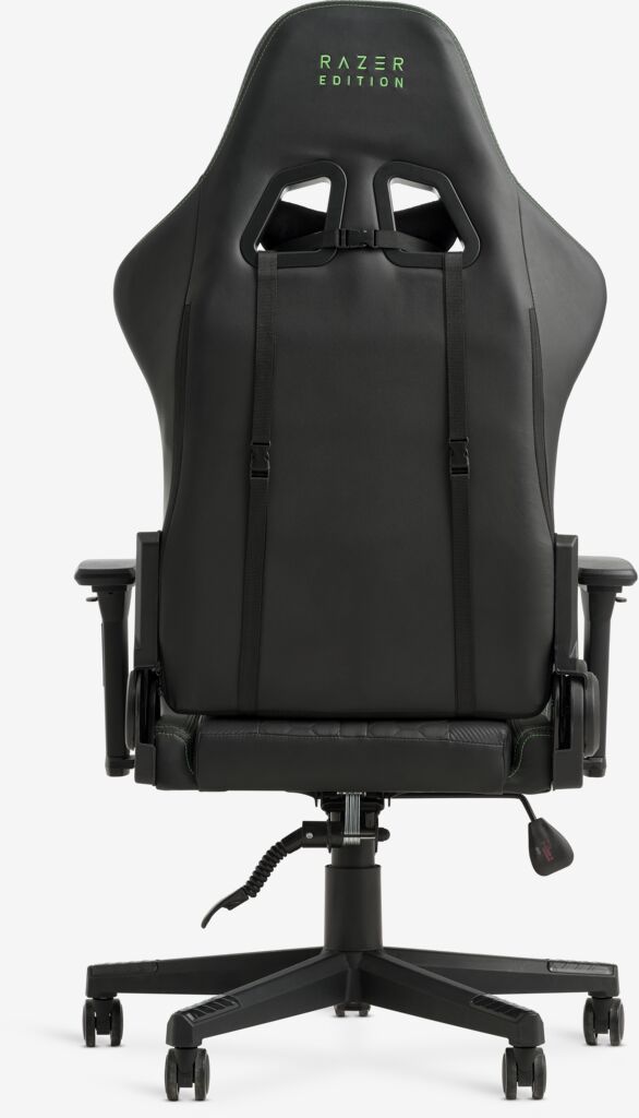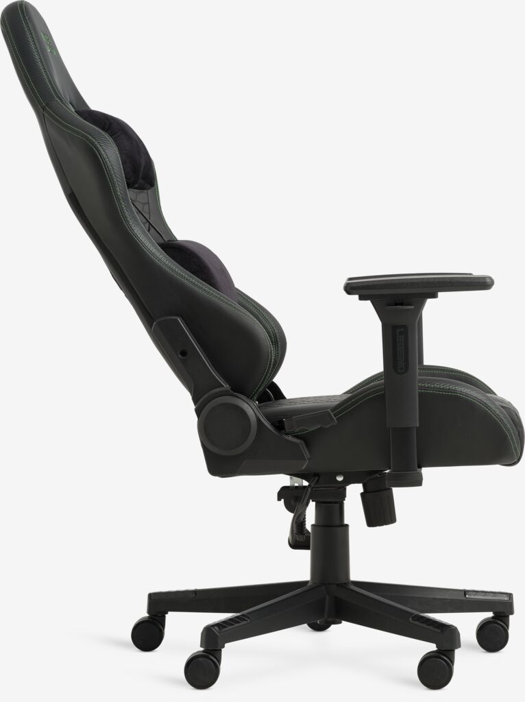 TYPE Z – RAZER EDITION™ BY LEGEND gaming chair is for the gamer who does not want to compromise on comfort or style. Get comfortable neck support with the pressure-relieving memory foam cushion, and adjust the armrests and backrest to your needs. The seat is covered in black faux leather with green and black stitching details in a graphic pattern. W70 x H126-136 x D70 cm